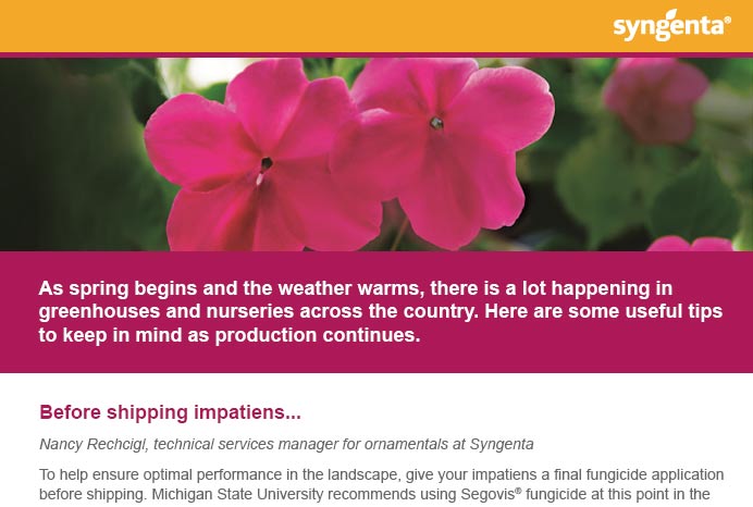 At Syngenta, we're committed to partnering with greenhouse and nursery growers to develop innovative agronomic solutions that result in beautifully strong, marketable ornamental plants. This commitment to success is strengthened by our plant protection products that provide effective and economical solutions for controlling diseases, insects and weeds in greenhouse and nursery plants. With a variety of fungicides, insecticides, herbicides and plant growth regulators, our portfolio has something for every operation.
